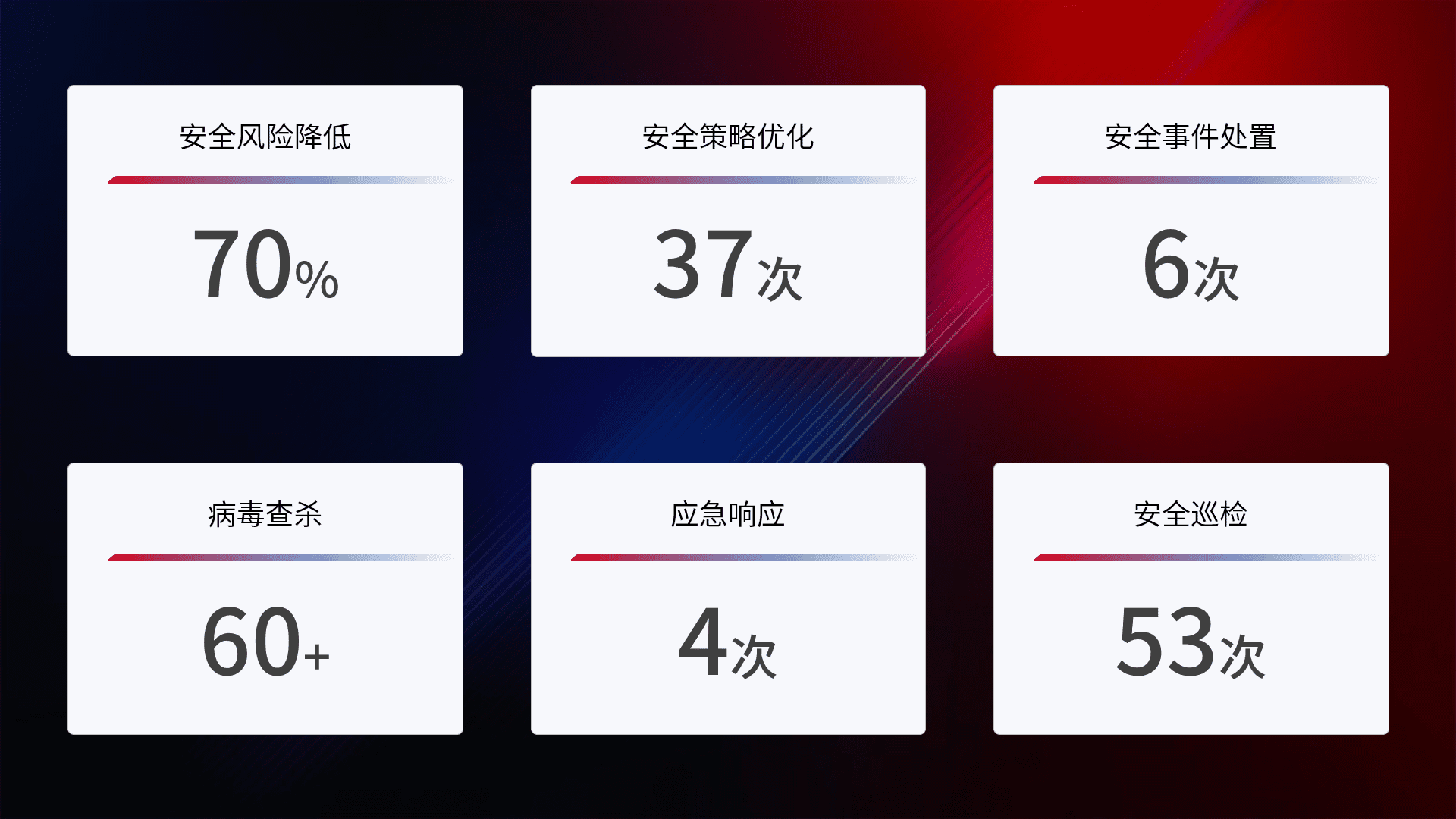 提供全面的安全事件报告体系,,包括处置报告、、、、周报、、、、季度和年度总结,,,,结合持续监控,,,帮助客户深入了解网络安全状况。。。
